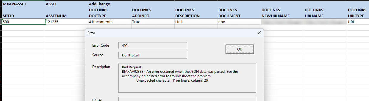 When trying to update URL attachments to our assets, we get a cryptic error seen below. Is it possible to load DOCLINKS with MxLoader?