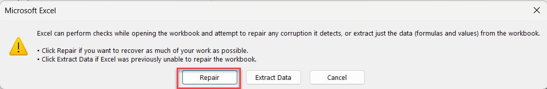 2. Next, click the down arrow next to Open > Open and Repair.